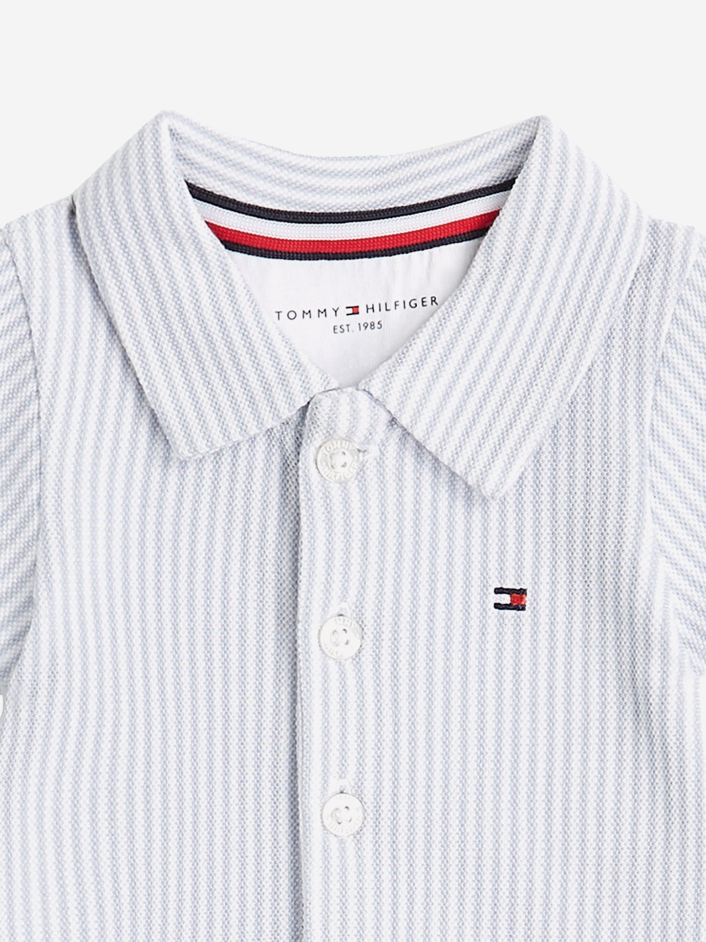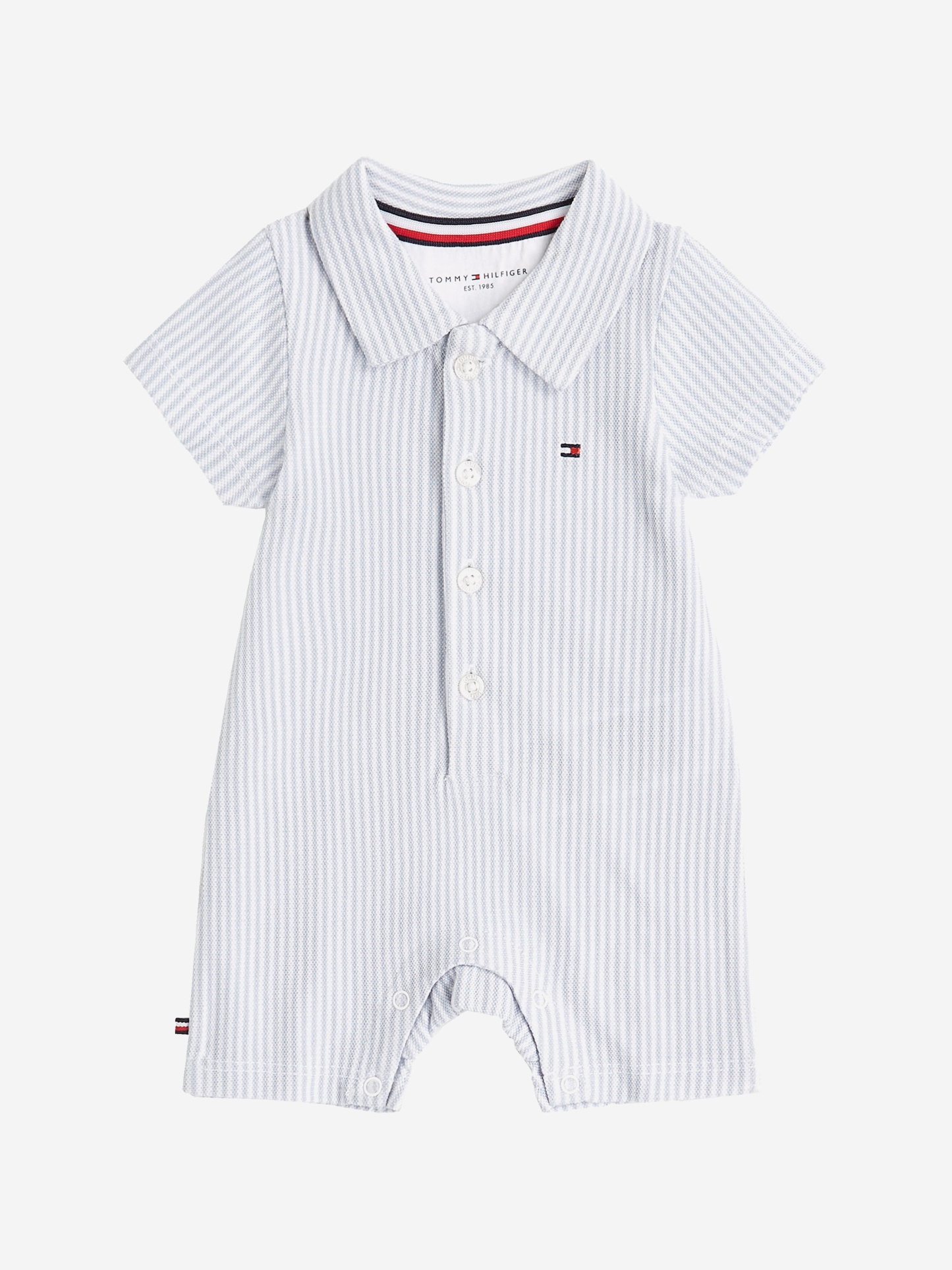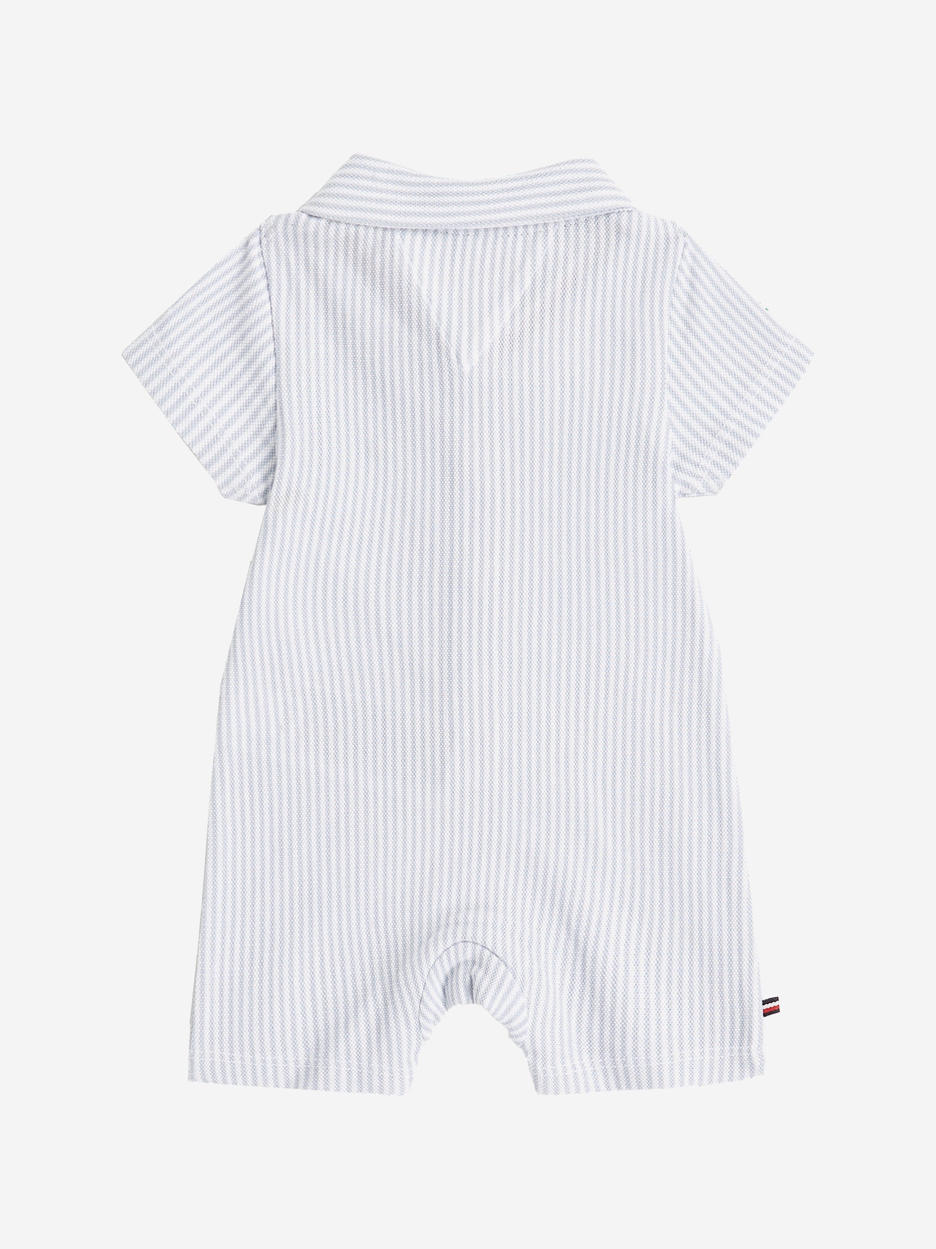 Introducing the SS2025 Tommy Hilfiger Baby Boys Striped Romper in Blue, an exquisite staple for your little one’s wardrobe.