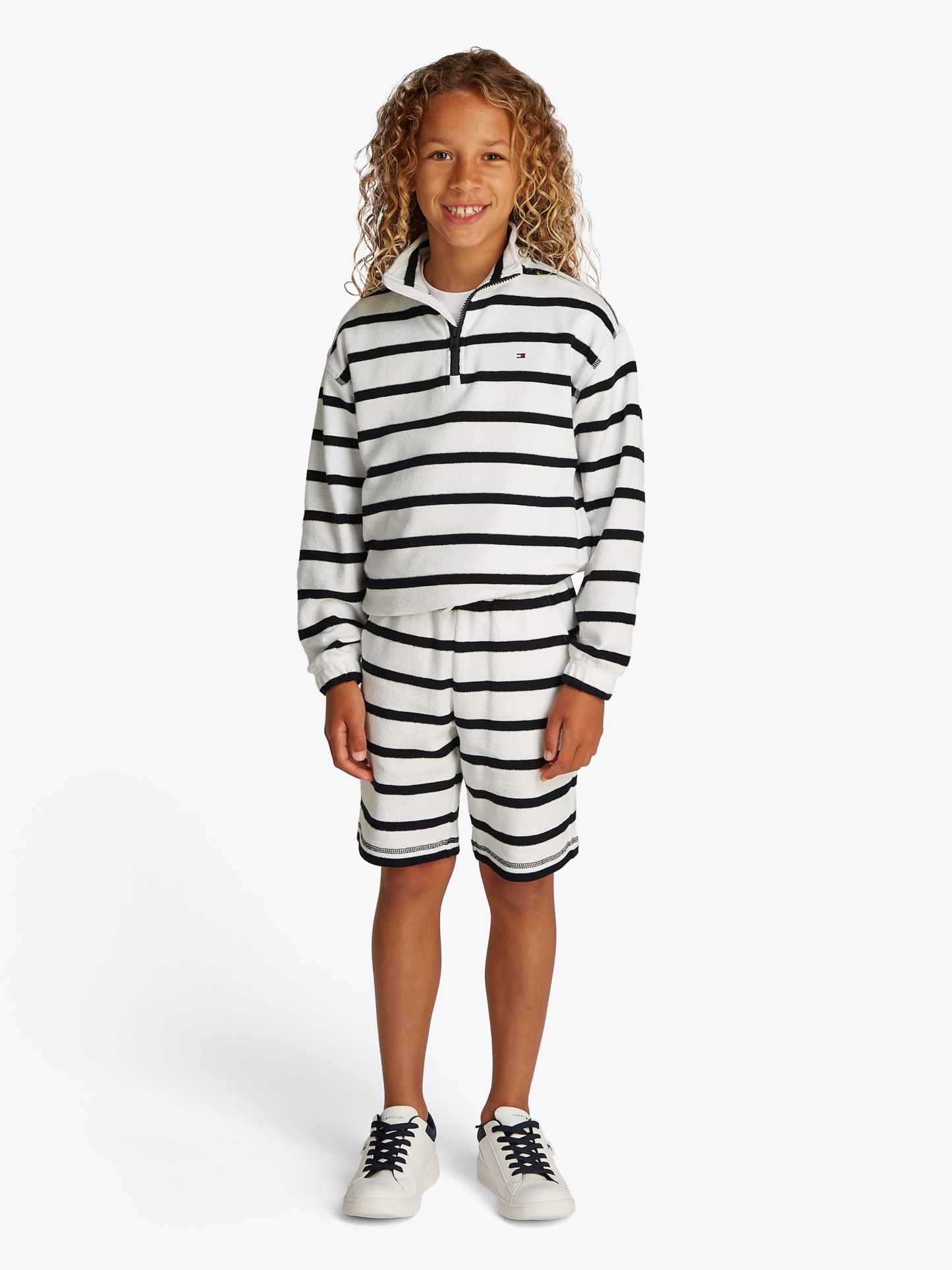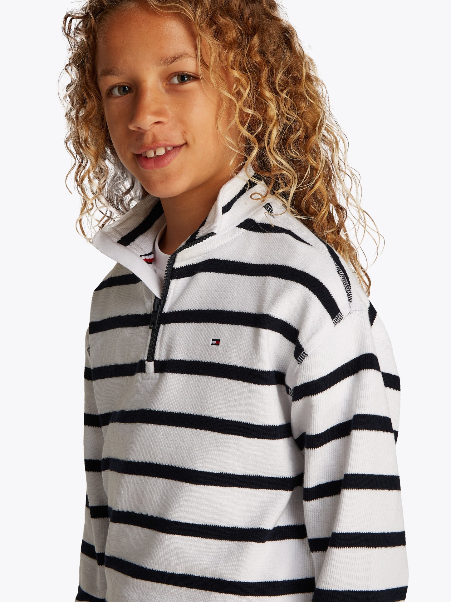 Introducing the Tommy Hilfiger Boys Breton Stripe Half Zip Sweatshirt in White, a key piece for SS2025. Stylishly crafted to blend iconic comfort with timeless design, it's a standout addition to any young gentleman's wardrobe. Highlights include: