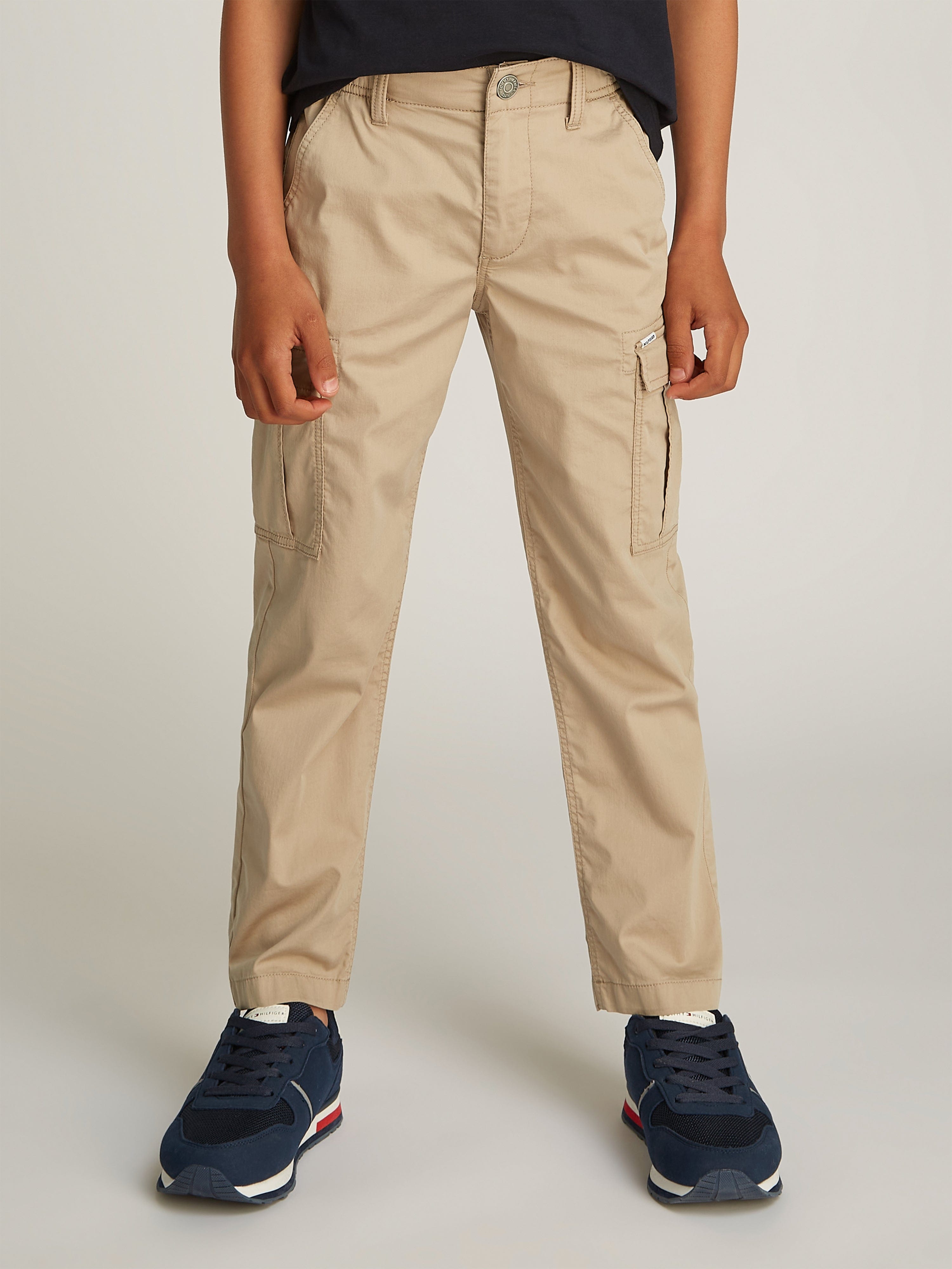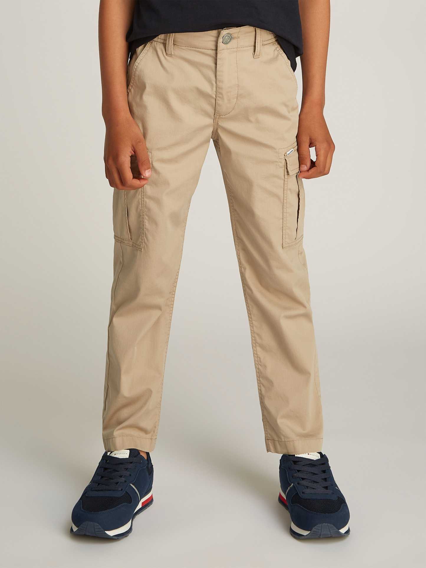 Discover the epitome of both charm and utility with Tommy Hilfiger's Boys Cargo Trousers in sophisticated beige. An indispensable addition to your boy's SS2025 wardrobe with features meticulously designed for youthful elegance and practicality: