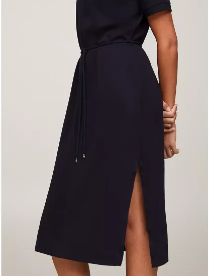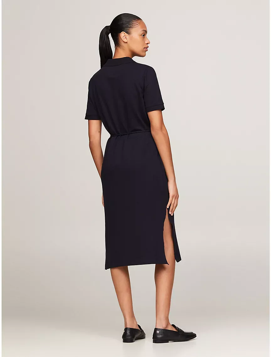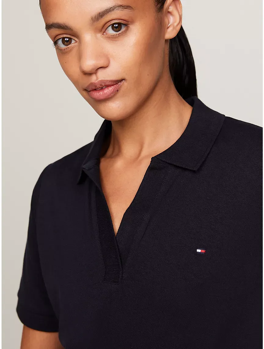 - Polo collar, open placket, side walking slits, short sleeves, embroidered microflag at chest.