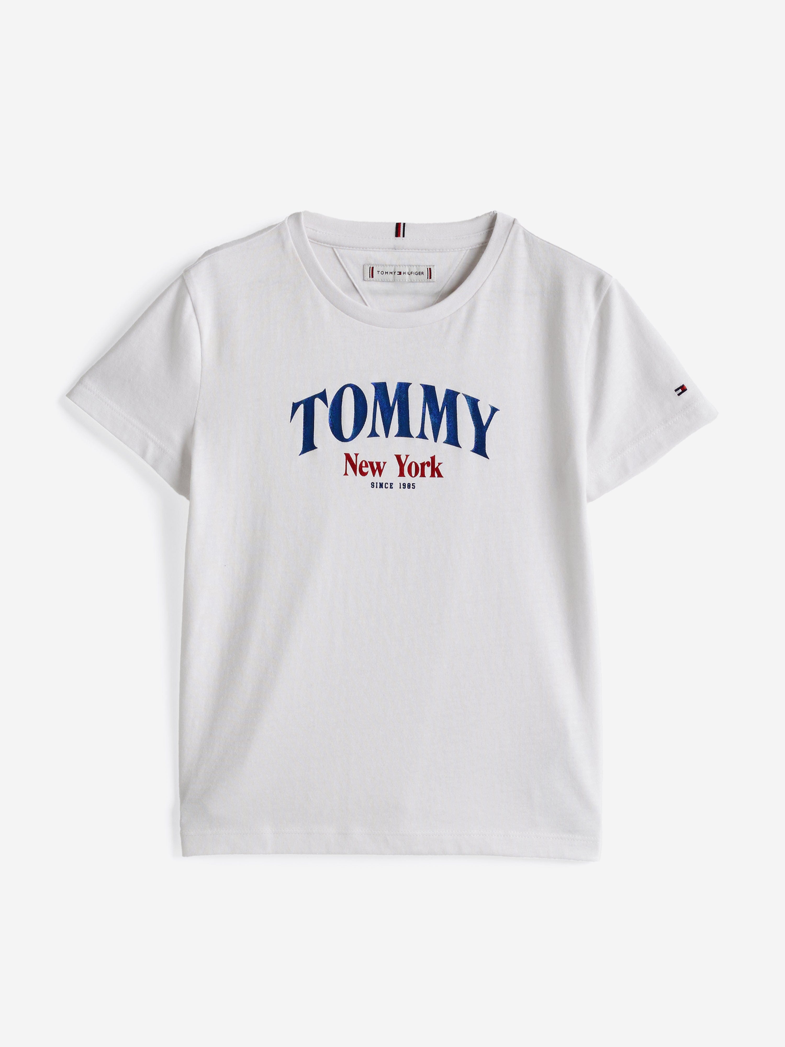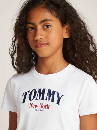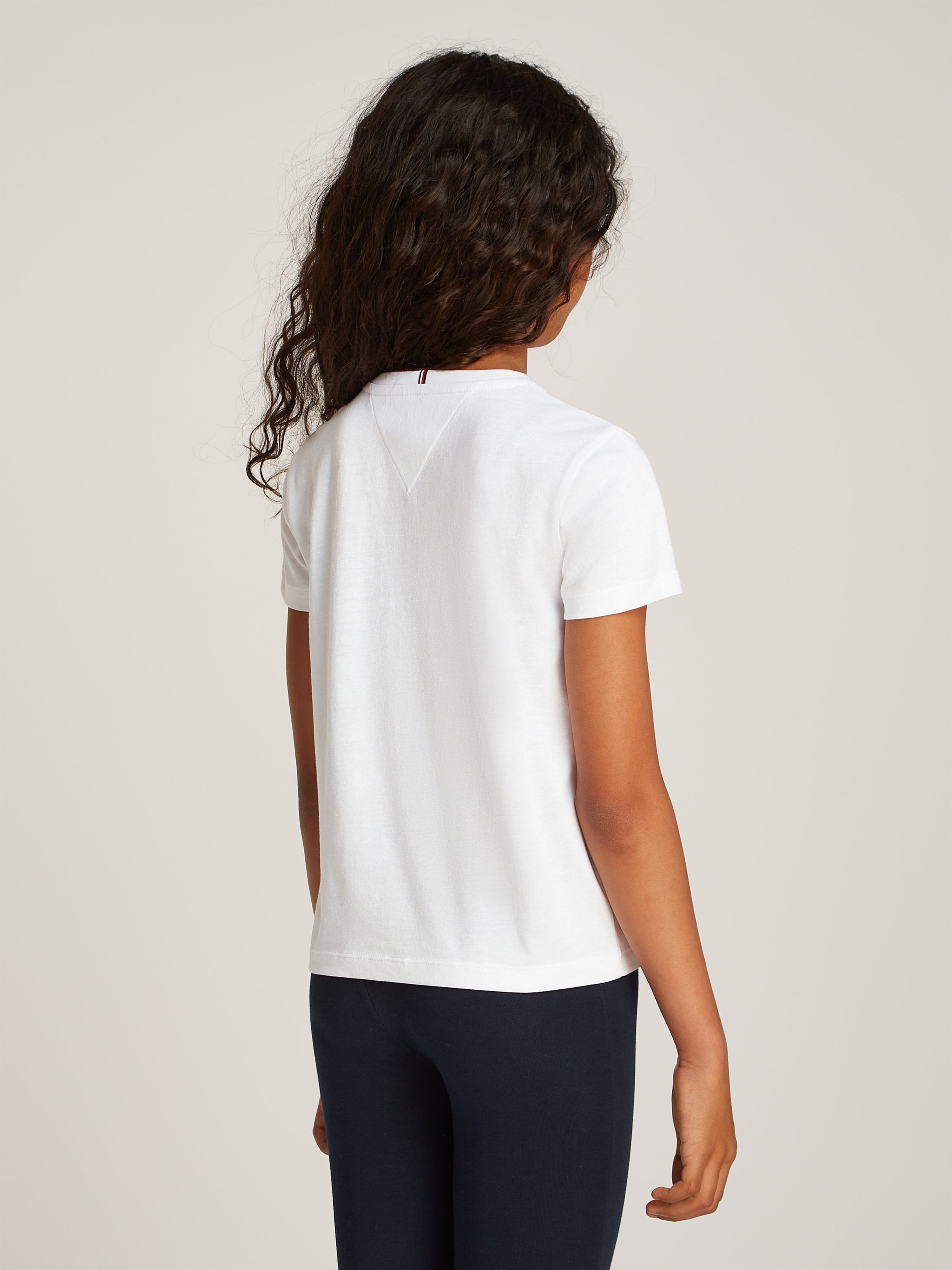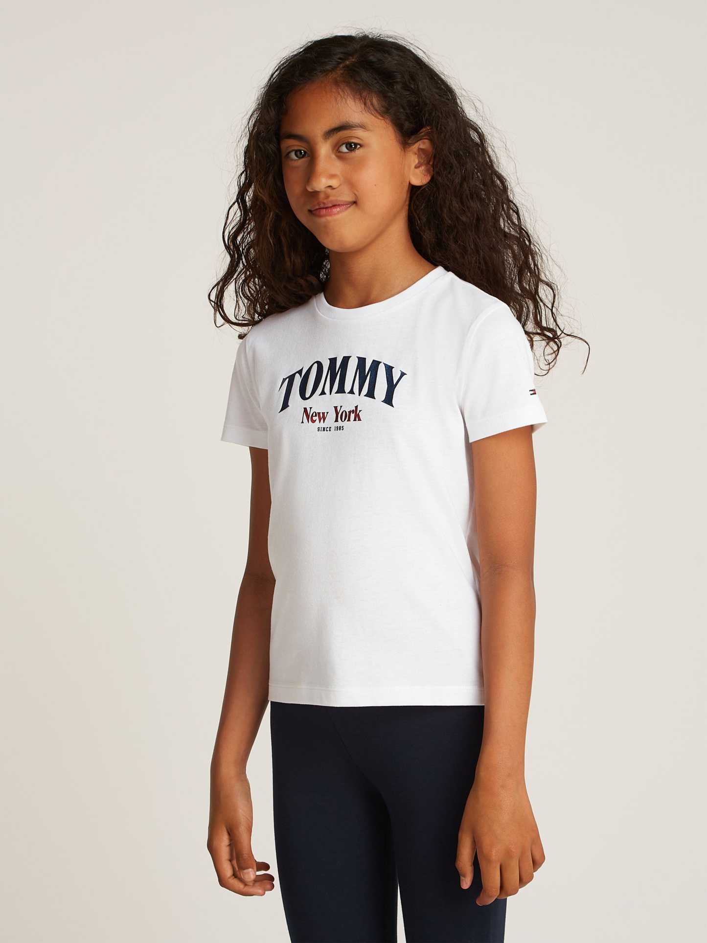 Introducing the splendid Girls Varsity Regular T-Shirt in White by Tommy Hilfiger, an essential addition for SS2025. Crafted with precision, it promises elegance and ease for every young lady's wardrobe.