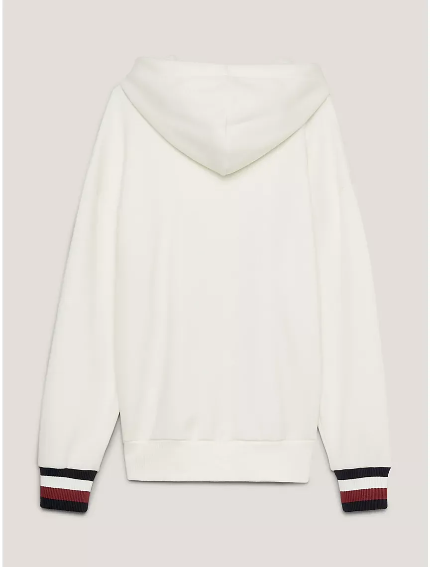 - Drawstring hood, signature stripe trim at cuffs.