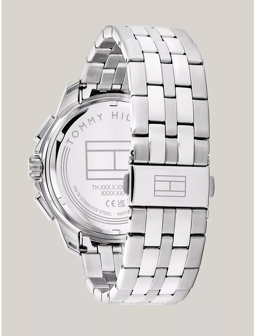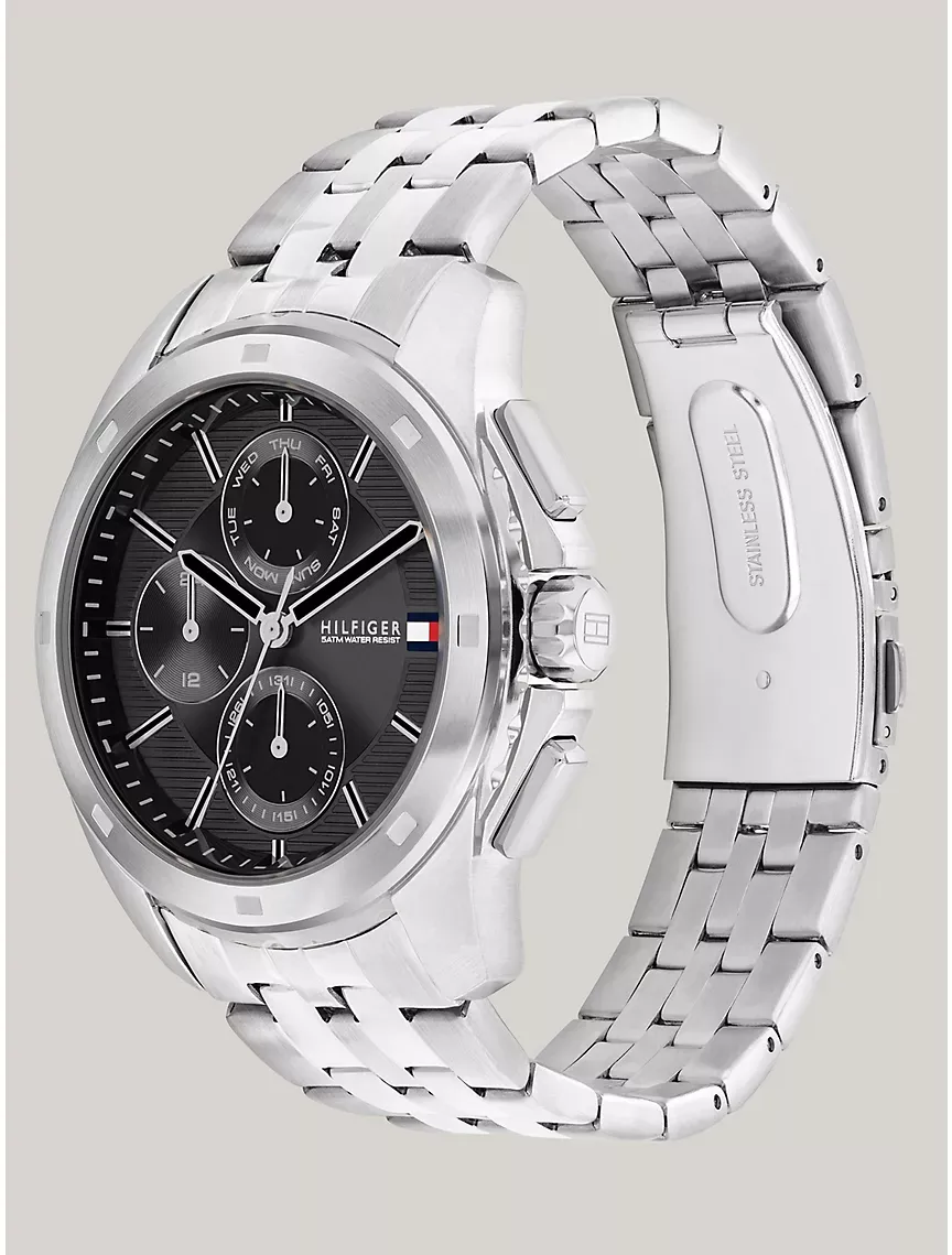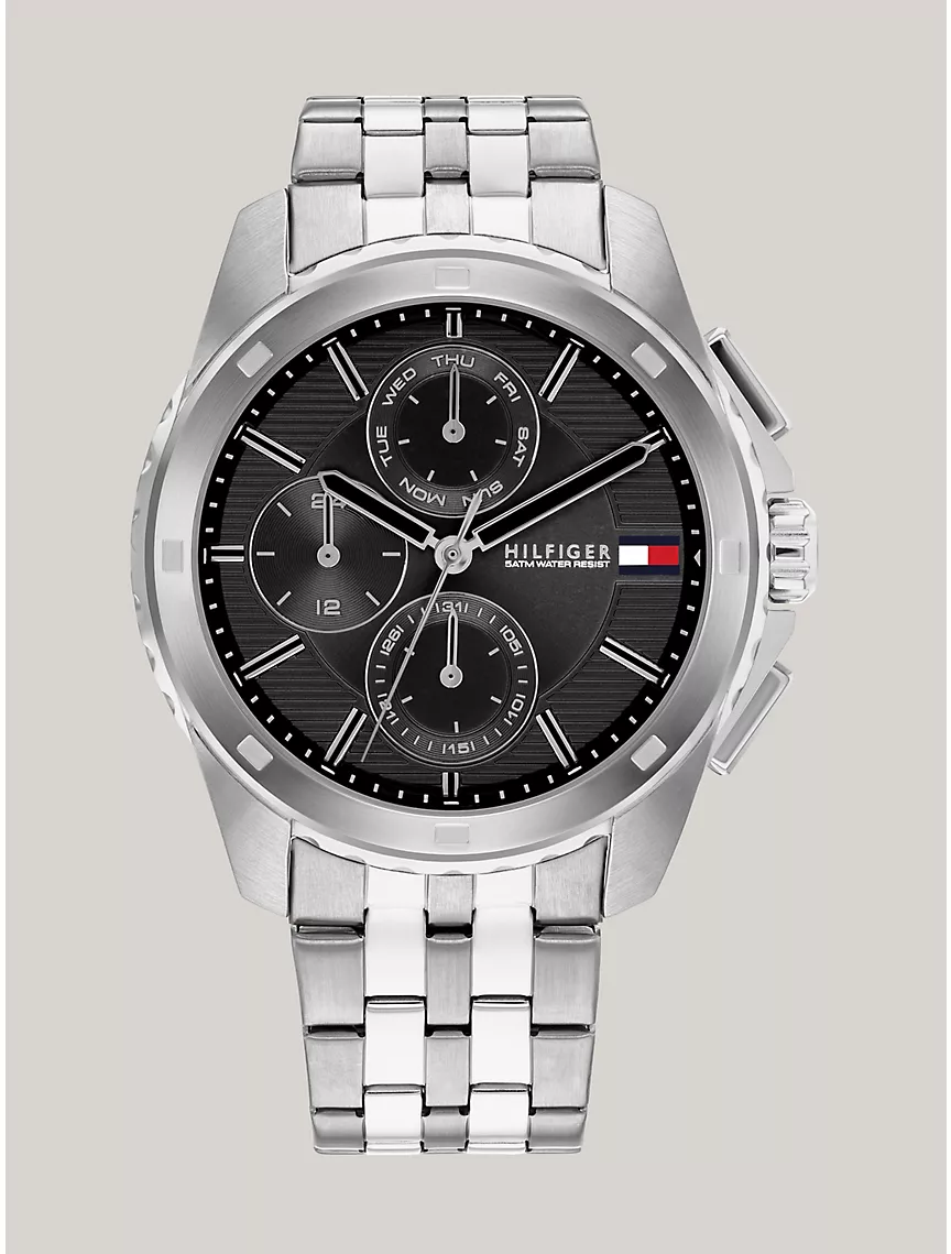 - 44mm stainless steel case and integrated bracelet, black dial, multifunction movement, sub-dials.