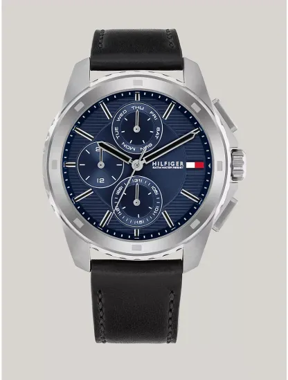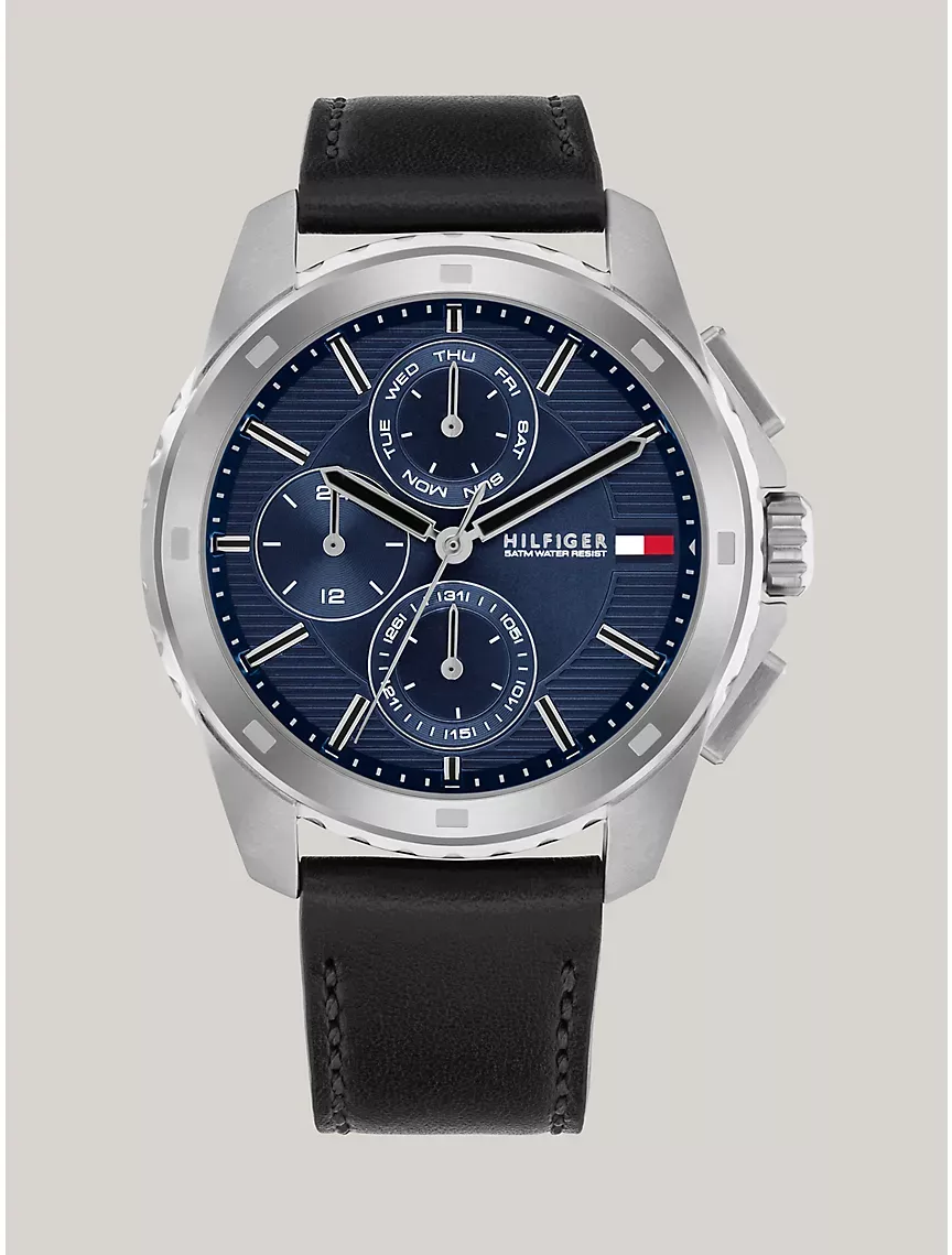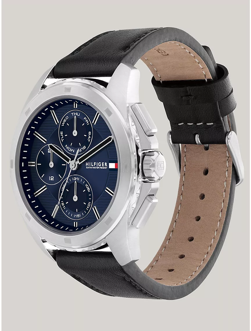 - 44mm stainless steel case, blue dial, black leather strap, multifunction movement, sub-dials.
